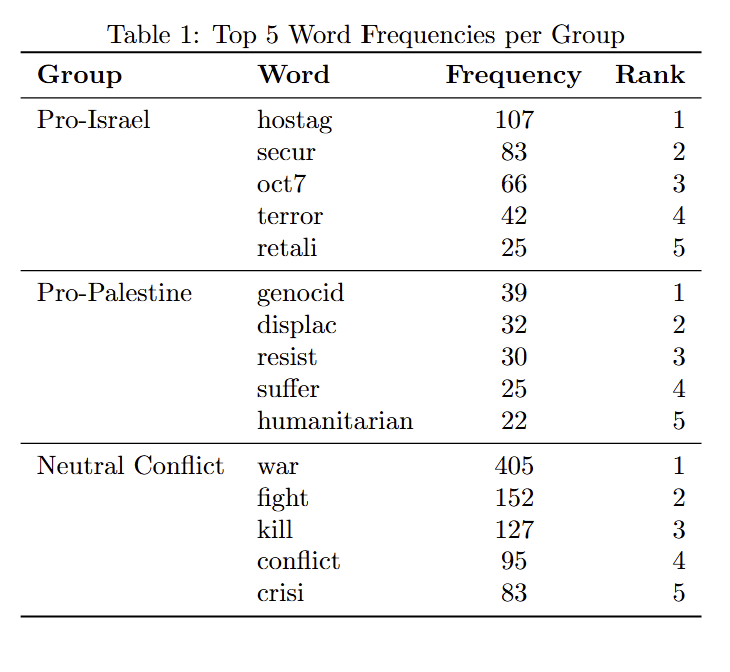 Additionally Israeli TF-IDF set also includes terms regarding conflict such as “plan,” “strike,” and “attack,” which stands in direct contrast to the Palestinian terms which only includes the word “war.” While their prevalence may be due to a presentation of Israel as the aggressor, these terms occur far less than terms such as “oct 7” and “hamas,” words used to frame the conflict through the lens of retaliation. As a result, it suggests that violence occurring on both side is being filtered through the presentation of Israel as a justified victim within the conflict. As well, the contrast creates a framing of Israeli actors as strategic and active agents in the region, while Palestinian actors are framed primarily as subjects of violence or humanitarian crises.