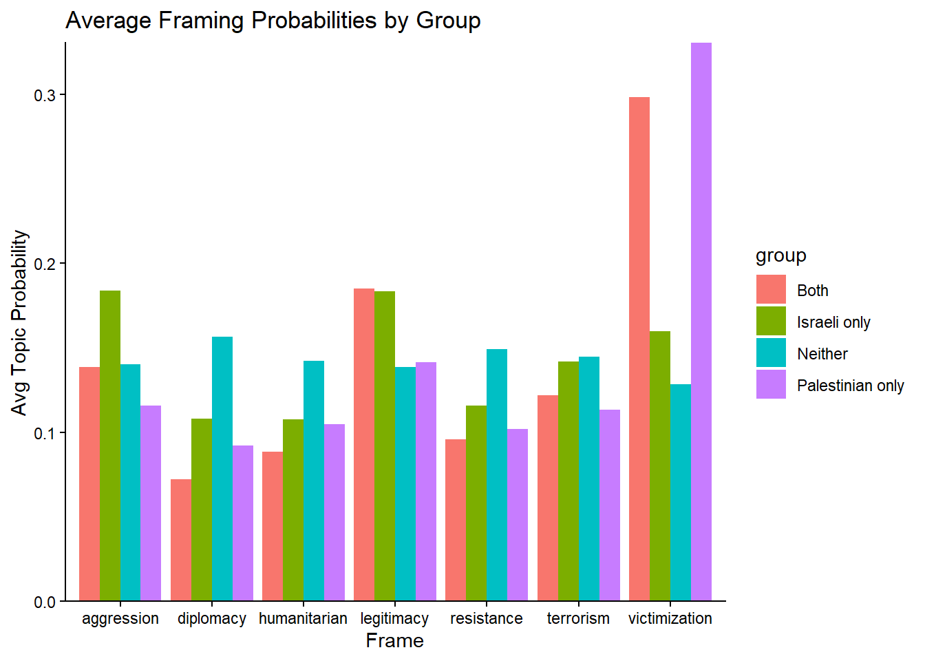To explore the prevalence across groups, I graphed the average framing probabilities by term of headlines. Headlines flagged only Palestinians as well as both Israelis and Palestinians scored highest on the Victimization frame, consistent with an emphasis on civilian harm and humanitarian suffering. This also supports the idea that Palestinian harm and suffering is qualified by Israeli harm (specifically with the events on October 7th).