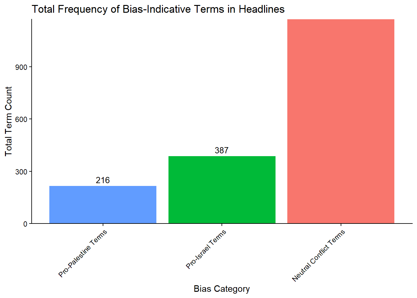 The flagged term analysis reveals a clear imbalance in how bias-indicative language appears across headlines. As shown above, terms associated with the Neutral/Conflict category dominate the corpus, appearing 1,173 times, far greater either sided terms. By contrast, Pro-Israel terms appeared 387 times, while Pro-Palestine terms appeared only 216 times.
