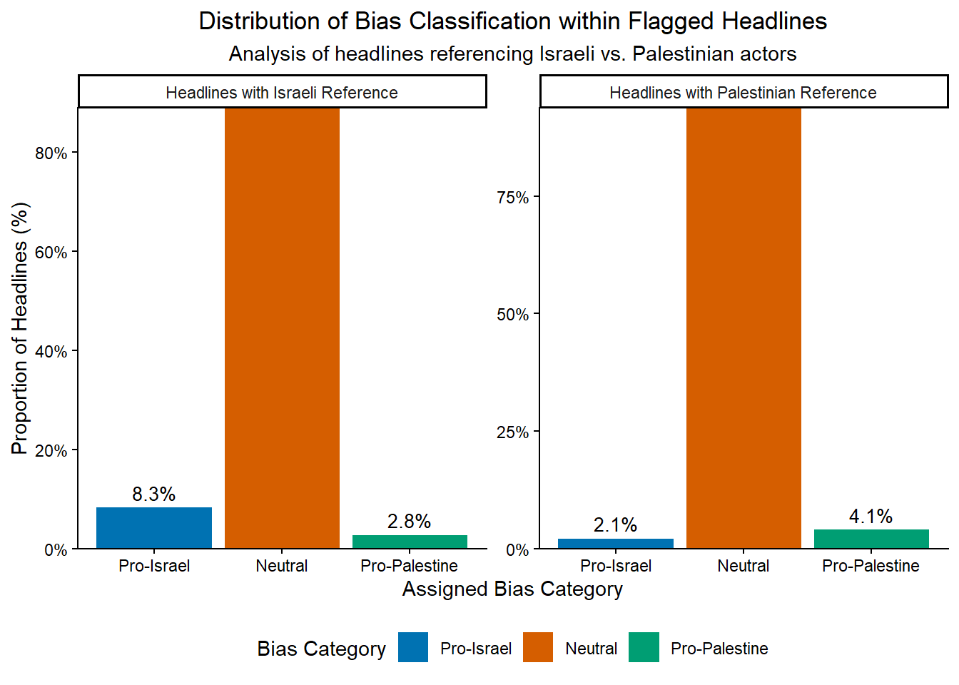 The figure above shows a asymmetry in the frequency of bias-indicative terms between the two groups. Headlines flagged with Israeli references contained a much larger share of Pro-Israel terms than Pro-Palestine terms, indicating a bias toward Israeli perspectives when the actor is named explicitly. In contrast, headlines flagged with Palestinian references did not exhibit a similar skew toward Pro-Palestine terms. Instead, these headlines relied more heavily on Neutral conflict language or humanitarian descriptors, underscoring the earlier finding that Palestinian actors are less often framed through partisan terms and more often through generalized or humanitarianized language.
