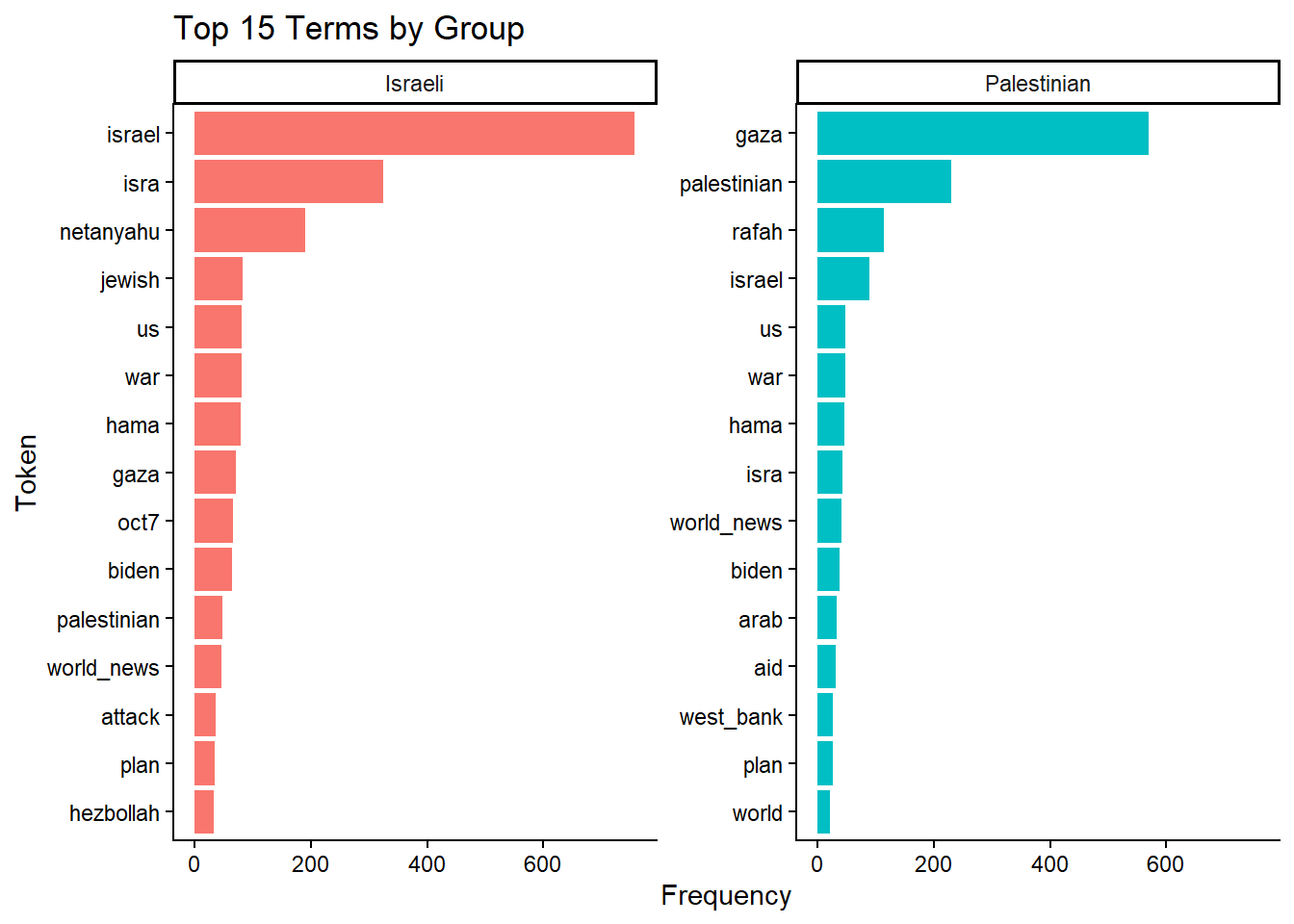 To explore differences in how Israeli and Palestinian actors are framed, I analyzed the most frequent terms in headlines tagged as referencing each group.