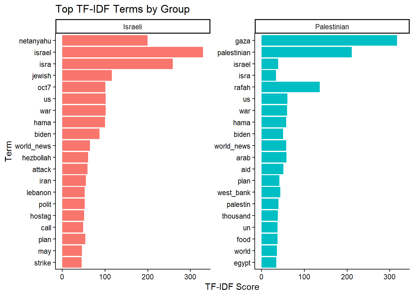 To further explore the differences in sentiment between the two groups, I calculated TF-IDF scores for each group and visualized the top terms. As opposed to the basic term-frequency analysis, TF-IDF scores works to identify terms that are particularly distinctive to each group, rather than just the most frequent terms across both groups — helping to highlight any unique language used in headliens referencing Israeli and Palestinian actors.
