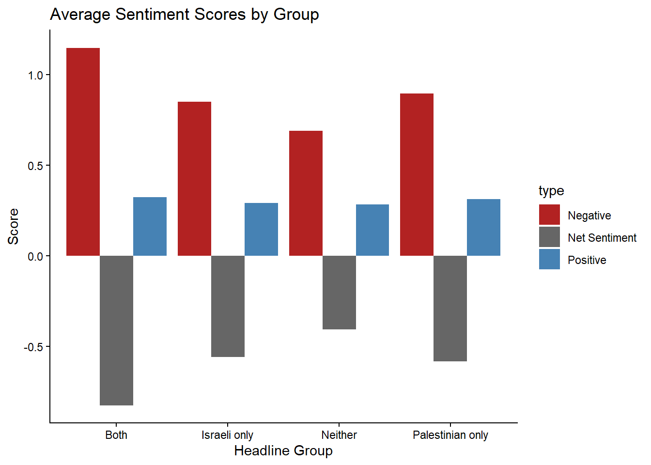 As shown in figure, the results reveal relatively small differences in average sentiment across groups. Headlines that reference both Israeli and Palestinian actors show slightly higher negative sentiment and lower net sentiment than those referencing only one side. However, overall variation is minimal.